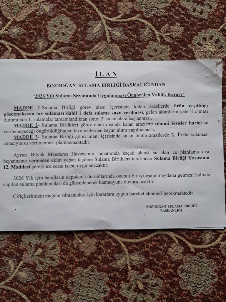 Bozdoğan Sulama Birliği’nin duyurusuna göre, görev alanı içerisindeki tüm arazilerde ürün çeşitliliğine bakılmaksızın yalnızca 1 defa sulama suyu verilecek. Gelen akımların yeterli olması durumunda ilk sulamalar tamamlandıktan sonra ikinci sulamaya başlanmayacak.