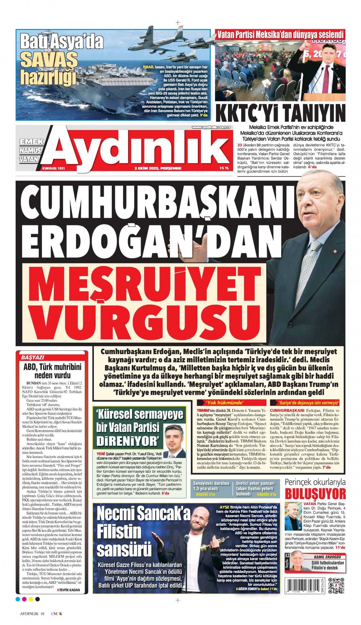 Aydınlık Gazetesi 2 Ekim 2025 Günü Gazete Manşetleri