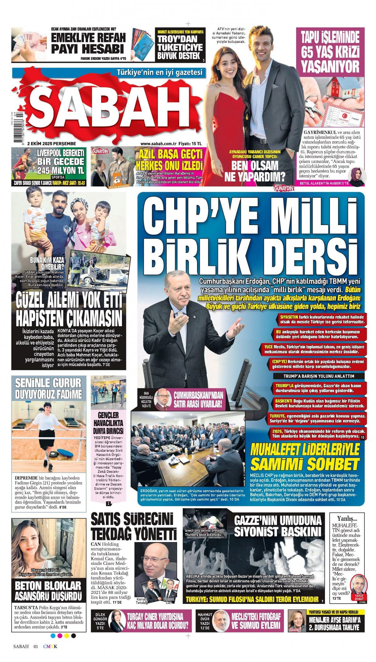 Sabah Gazetesi 2 Ekim 2025 Günü Gazete Manşetleri