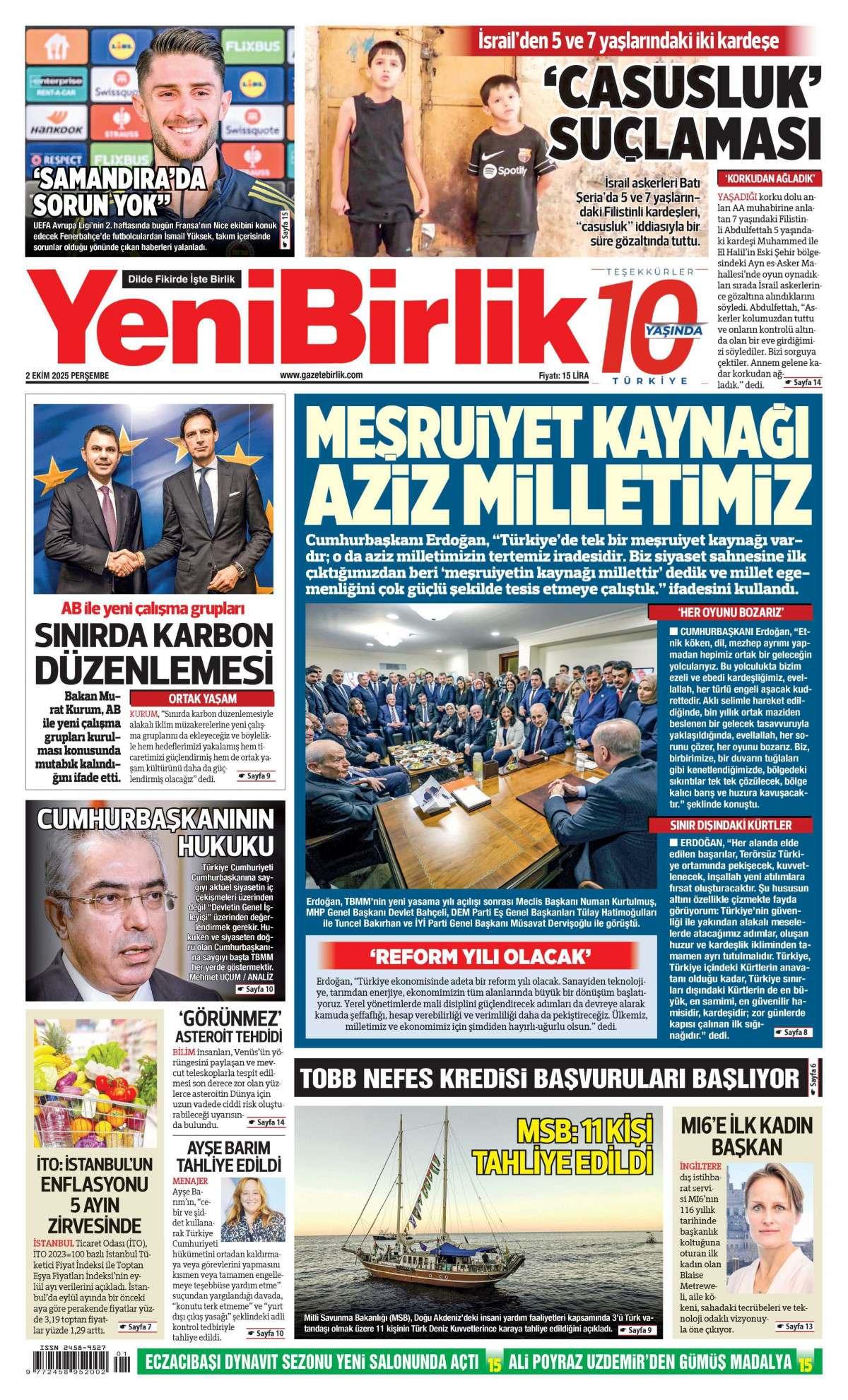 Yeni Birlik Gazetesi 2 Ekim 2025 Günü Gazete Manşetleri